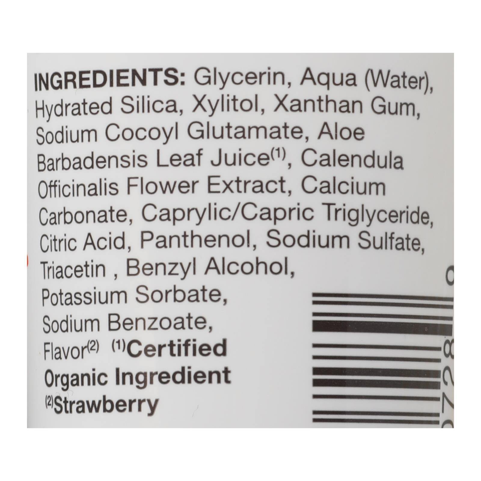 Ingredients: GLYCERIN;AQUA;WATER;HYDRATED SILICA;XYLITOL;XANTHAN GUM;SODIUM COCOYL GLUTAMATE;ALOE BARBADENSIS LEAF JUICER?1?;CALENDULA OFFICINALIS FLOWER EXTRACT;CALCIUM CARBONATE;CAPRYLIC/CAPRIC TRIGLYCERIDE;CITRIC ACID;PANTHENOL;SODIUM SULFATE;TRIACETIN;BENZYL ALCOHOL;POTASSIUM SORBATE;SODIUM BENZOATE;FLAVOR ?2?